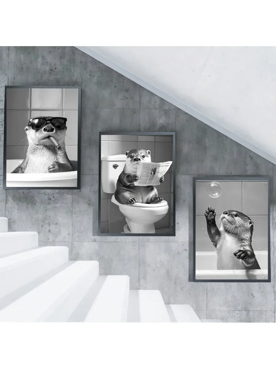 Funny Otters & Raccoons Baths Canvas Prints Cats Drinking Animals Wall Art Posters for Modern Living Room Bathroom Home Decor