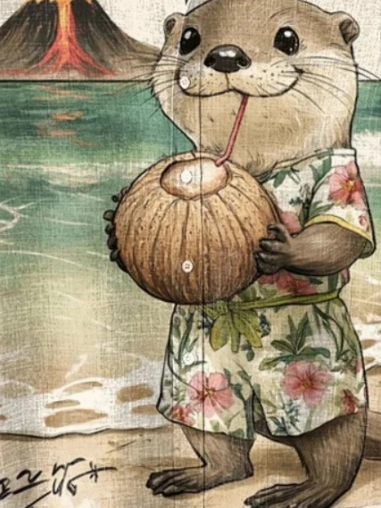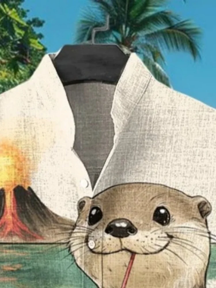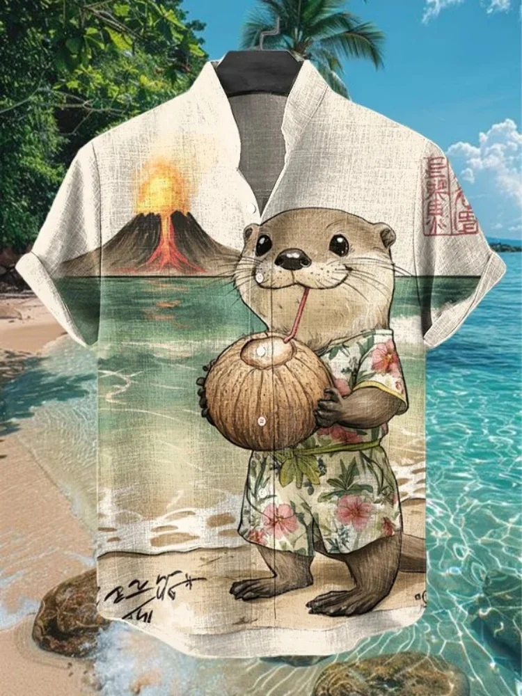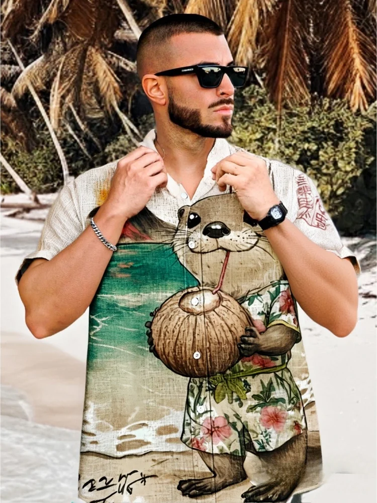 Men's Cute Otter Drinking Coconut Juice Print Short Sleeve Shirt
